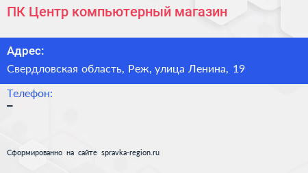 ПК-Центр, компьютерный магазин по адресу Свердловская область, Реж, улица Ленина, 19 в дальнейшем Организация, размещена в следующих категориях: