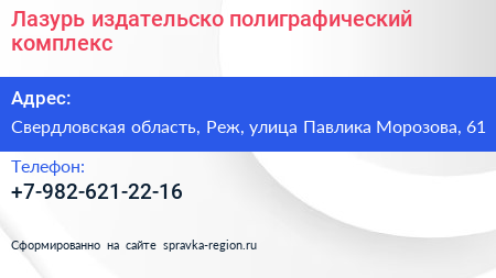 Лазурь, издательско-полиграфический комплекс по адресу Свердловская область, Реж, улица Павлика Морозова, 61 в дальнейшем Организация, размещена в следующих категориях: