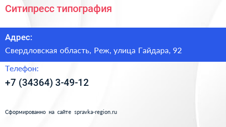 Ситипресс, типография по адресу Свердловская область, Реж, улица Гайдара, 92 в дальнейшем Организация, размещена в следующих категориях: