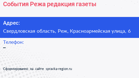 События Режа, редакция газеты по адресу Свердловская область, Реж, Красноармейская улица, 6 в дальнейшем Организация, размещена в следующих категориях:
