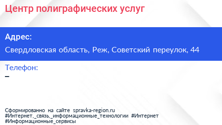 Центр полиграфических услуг по адресу Свердловская область, Реж, Советский переулок, 44 в дальнейшем Организация, размещена в следующих категориях: