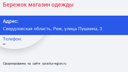 Бережок, магазин одежды по адресу Свердловская область, Реж, улица Пушкина, 3 в дальнейшем Организация, размещена в следующих категориях: