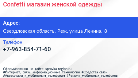 Confetti, магазин женской одежды по адресу Свердловская область, Реж, улица Ленина, 8 в дальнейшем Организация, размещена в следующих категориях: