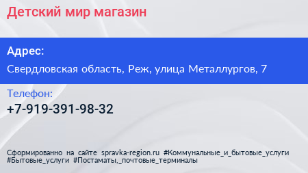 Детский мир, магазин по адресу Свердловская область, Реж, улица Металлургов, 7 в дальнейшем Организация, размещена в следующих категориях: