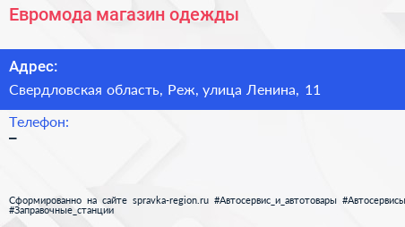 Евромода, магазин одежды по адресу Свердловская область, Реж, улица Ленина, 11 в дальнейшем Организация, размещена в следующих категориях: