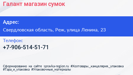 Галант, магазин сумок по адресу Свердловская область, Реж, улица Ленина, 23 в дальнейшем Организация, размещена в следующих категориях: