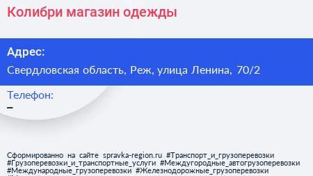 Колибри, магазин одежды по адресу Свердловская область, Реж, улица Ленина, 70/2 в дальнейшем Организация, размещена в следующих категориях: