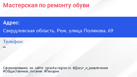 Мастерская по ремонту обуви по адресу Свердловская область, Реж, улица Полякова, 69 в дальнейшем Организация, размещена в следующих категориях: