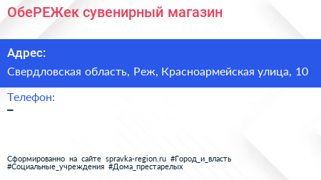 ОбеРЕЖек, сувенирный магазин по адресу Свердловская область, Реж, Красноармейская улица, 10 в дальнейшем Организация, размещена в следующих категориях: