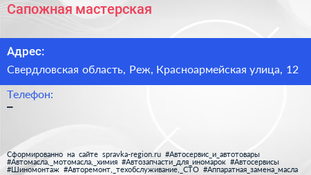 Сапожная мастерская по адресу Свердловская область, Реж, Красноармейская улица, 12 в дальнейшем Организация, размещена в следующих категориях: