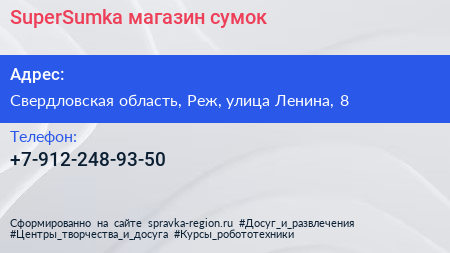SuperSumka, магазин сумок по адресу Свердловская область, Реж, улица Ленина, 8 в дальнейшем Организация, размещена в следующих категориях: