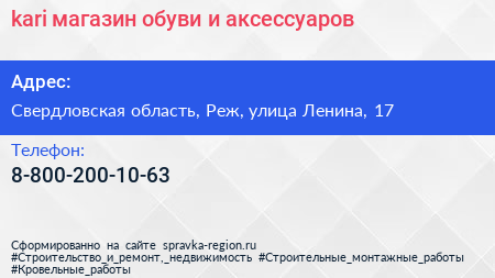 kari, магазин обуви и аксессуаров по адресу Свердловская область, Реж, улица Ленина, 17 в дальнейшем Организация, размещена в следующих категориях: