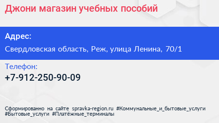 Джони, магазин учебных пособий по адресу Свердловская область, Реж, улица Ленина, 70/1 в дальнейшем Организация, размещена в следующих категориях: