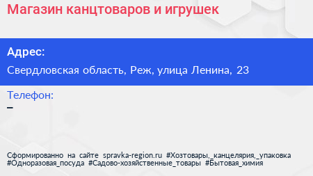Магазин канцтоваров и игрушек по адресу Свердловская область, Реж, улица Ленина, 23 в дальнейшем Организация, размещена в следующих категориях: