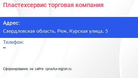Пластехсервис, торговая компания по адресу Свердловская область, Реж, Курская улица, 5 в дальнейшем Организация, размещена в следующих категориях:
