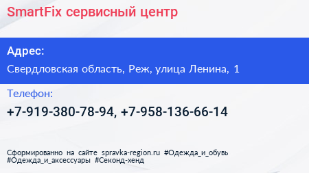 SmartFix, сервисный центр по адресу Свердловская область, Реж, улица Ленина, 1 в дальнейшем Организация, размещена в следующих категориях: