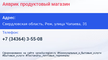 Аяврик, продуктовый магазин по адресу Свердловская область, Реж, улица Чапаева, 31 в дальнейшем Организация, размещена в следующих категориях: