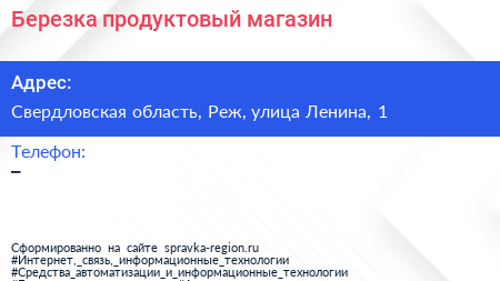 Березка, продуктовый магазин по адресу Свердловская область, Реж, улица Ленина, 1 в дальнейшем Организация, размещена в следующих категориях:
