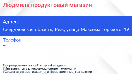 Людмила, продуктовый магазин по адресу Свердловская область, Реж, улица Максима Горького, 19 в дальнейшем Организация, размещена в следующих категориях: