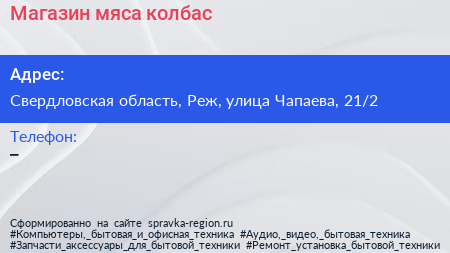 Магазин мяса, колбас по адресу Свердловская область, Реж, улица Чапаева, 21/2 в дальнейшем Организация, размещена в следующих категориях: