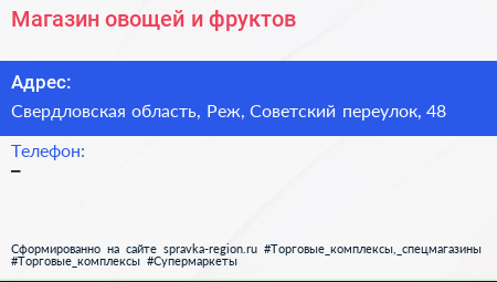 Магазин овощей и фруктов по адресу Свердловская область, Реж, Советский переулок, 48 в дальнейшем Организация, размещена в следующих категориях: