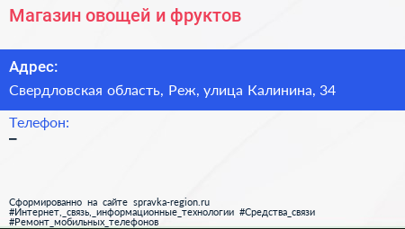 Магазин овощей и фруктов по адресу Свердловская область, Реж, улица Калинина, 34 в дальнейшем Организация, размещена в следующих категориях: