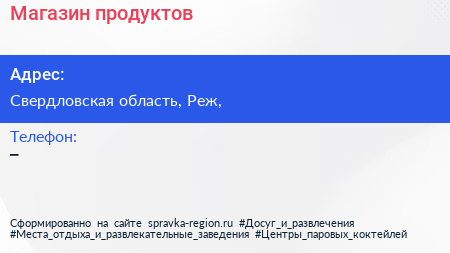 Магазин продуктов по адресу Свердловская область, Реж, в дальнейшем Организация, размещена в следующих категориях: