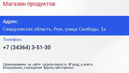 Магазин продуктов по адресу Свердловская область, Реж, улица Свободы, 1а в дальнейшем Организация, размещена в следующих категориях: