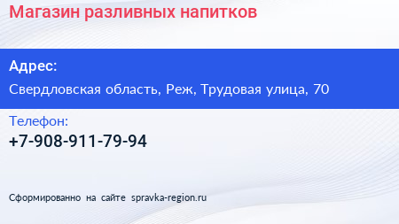 Магазин разливных напитков по адресу Свердловская область, Реж, Трудовая улица, 70 в дальнейшем Организация, размещена в следующих категориях: