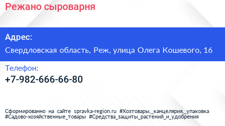 Режано, сыроварня по адресу Свердловская область, Реж, улица Олега Кошевого, 16 в дальнейшем Организация, размещена в следующих категориях: