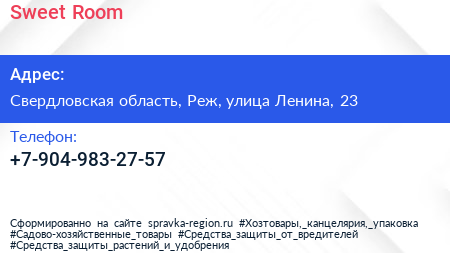 Sweet Room по адресу Свердловская область, Реж, улица Ленина, 23 в дальнейшем Организация, размещена в следующих категориях: