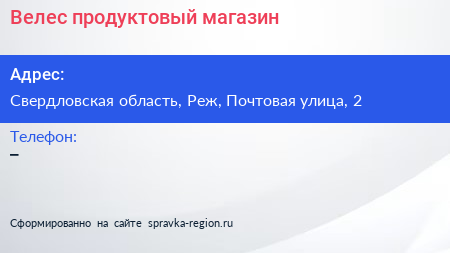 Велес, продуктовый магазин по адресу Свердловская область, Реж, Почтовая улица, 2 в дальнейшем Организация, размещена в следующих категориях: