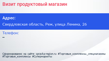 Визит, продуктовый магазин по адресу Свердловская область, Реж, улица Ленина, 26 в дальнейшем Организация, размещена в следующих категориях: