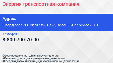 Энергия, транспортная компания по адресу Свердловская область, Реж, Зелёный переулок, 13 в дальнейшем Организация, размещена в следующих категориях: