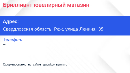 Бриллиант, ювелирный магазин по адресу Свердловская область, Реж, улица Ленина, 35 в дальнейшем Организация, размещена в следующих категориях: