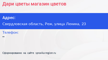Дари цветы, магазин цветов по адресу Свердловская область, Реж, улица Ленина, 23 в дальнейшем Организация, размещена в следующих категориях: