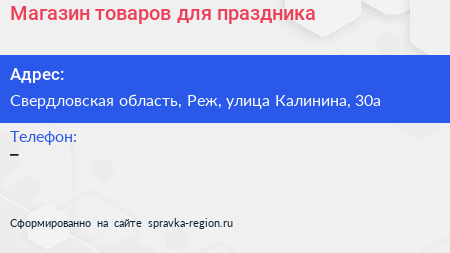 Магазин товаров для праздника по адресу Свердловская область, Реж, улица Калинина, 30а в дальнейшем Организация, размещена в следующих категориях: