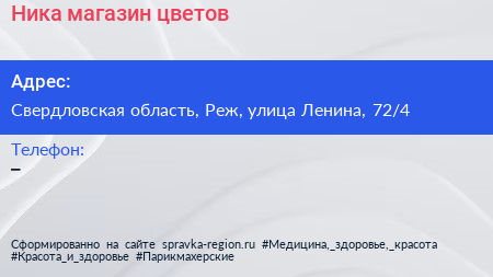 Ника, магазин цветов по адресу Свердловская область, Реж, улица Ленина, 72/4 в дальнейшем Организация, размещена в следующих категориях: