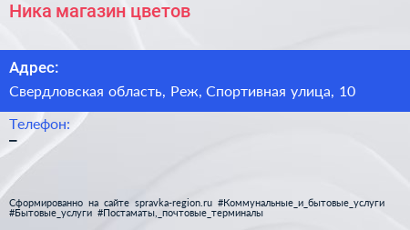 Ника, магазин цветов по адресу Свердловская область, Реж, Спортивная улица, 10 в дальнейшем Организация, размещена в следующих категориях: