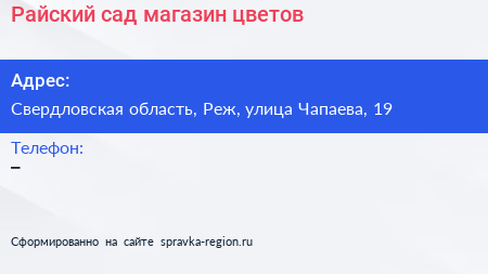 Райский сад, магазин цветов по адресу Свердловская область, Реж, улица Чапаева, 19 в дальнейшем Организация, размещена в следующих категориях: