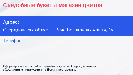 Съедобные букеты, магазин цветов по адресу Свердловская область, Реж, Вокзальная улица, 1а в дальнейшем Организация, размещена в следующих категориях: