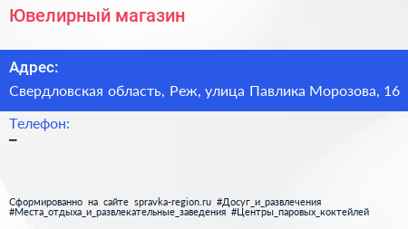 Ювелирный магазин по адресу Свердловская область, Реж, улица Павлика Морозова, 16 в дальнейшем Организация, размещена в следующих категориях: