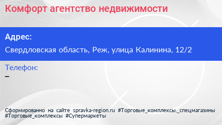 Комфорт, агентство недвижимости по адресу Свердловская область, Реж, улица Калинина, 12/2 в дальнейшем Организация, размещена в следующих категориях: