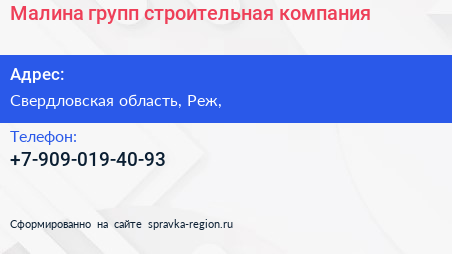 Малина групп, строительная компания по адресу Свердловская область, Реж, в дальнейшем Организация, размещена в следующих категориях: