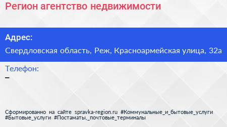 Регион, агентство недвижимости по адресу Свердловская область, Реж, Красноармейская улица, 32а в дальнейшем Организация, размещена в следующих категориях: