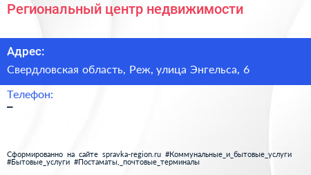 Региональный центр недвижимости по адресу Свердловская область, Реж, улица Энгельса, 6 в дальнейшем Организация, размещена в следующих категориях: