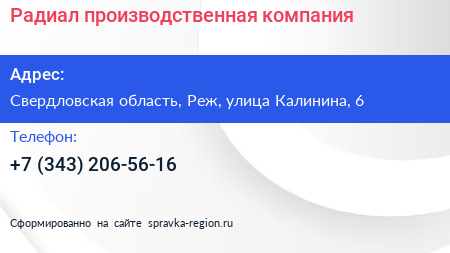Радиал, производственная компания по адресу Свердловская область, Реж, улица Калинина, 6 в дальнейшем Организация, размещена в следующих категориях: