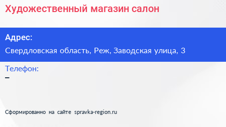 Художественный магазин-салон по адресу Свердловская область, Реж, Заводская улица, 3 в дальнейшем Организация, размещена в следующих категориях: