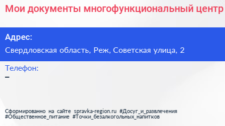 Мои документы, многофункциональный центр по адресу Свердловская область, Реж, Советская улица, 2 в дальнейшем Организация, размещена в следующих категориях: