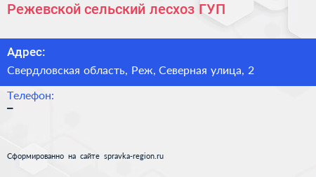 Режевской сельский лесхоз, ГУП по адресу Свердловская область, Реж, Северная улица, 2 в дальнейшем Организация, размещена в следующих категориях: